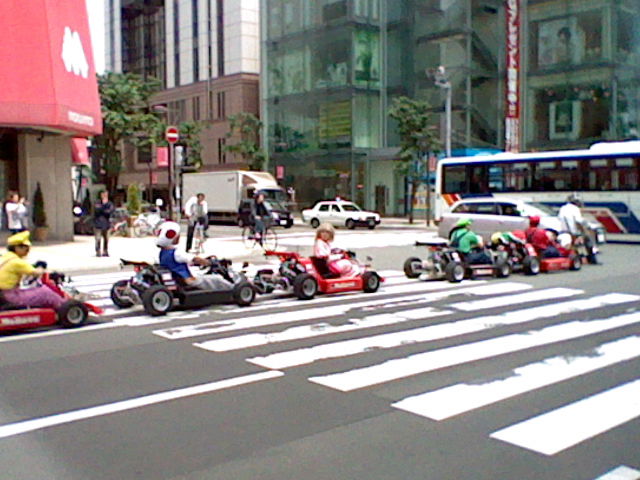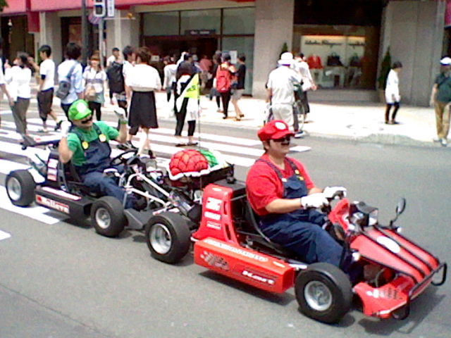 ちなみに残念ながら写真上からは見切れてしまっているが、集団は前から順にマリオ・ルイージ・ピーチ・キノピオ・ワリオ・ワルイージと、総勢6人の編成になっておりました。先月の記事からさらにひとり増えてんのな(笑)、つーかヨッシーコスがいなかったってワケか。